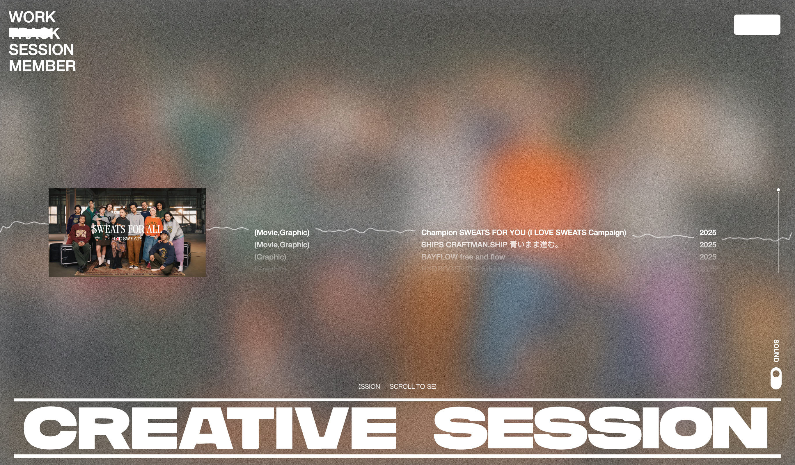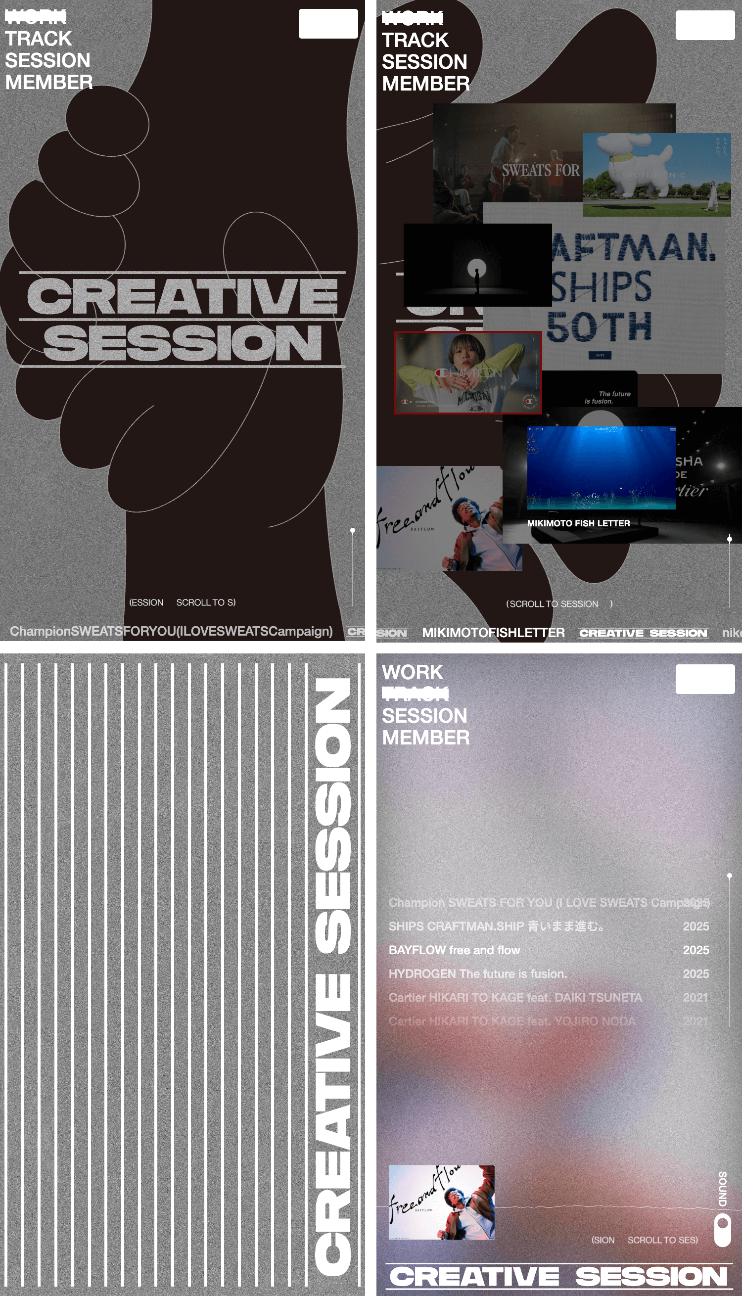 ランダムに配置されたスクロール体験、TRACKでは音楽に同期して流れ、スクラッチするようなインタラクションなど、点でなく“流れ”として魅せる演出設計を行いました。 クリエイティブチーム「CREATIVE SESSION」のサイトを制作しました。