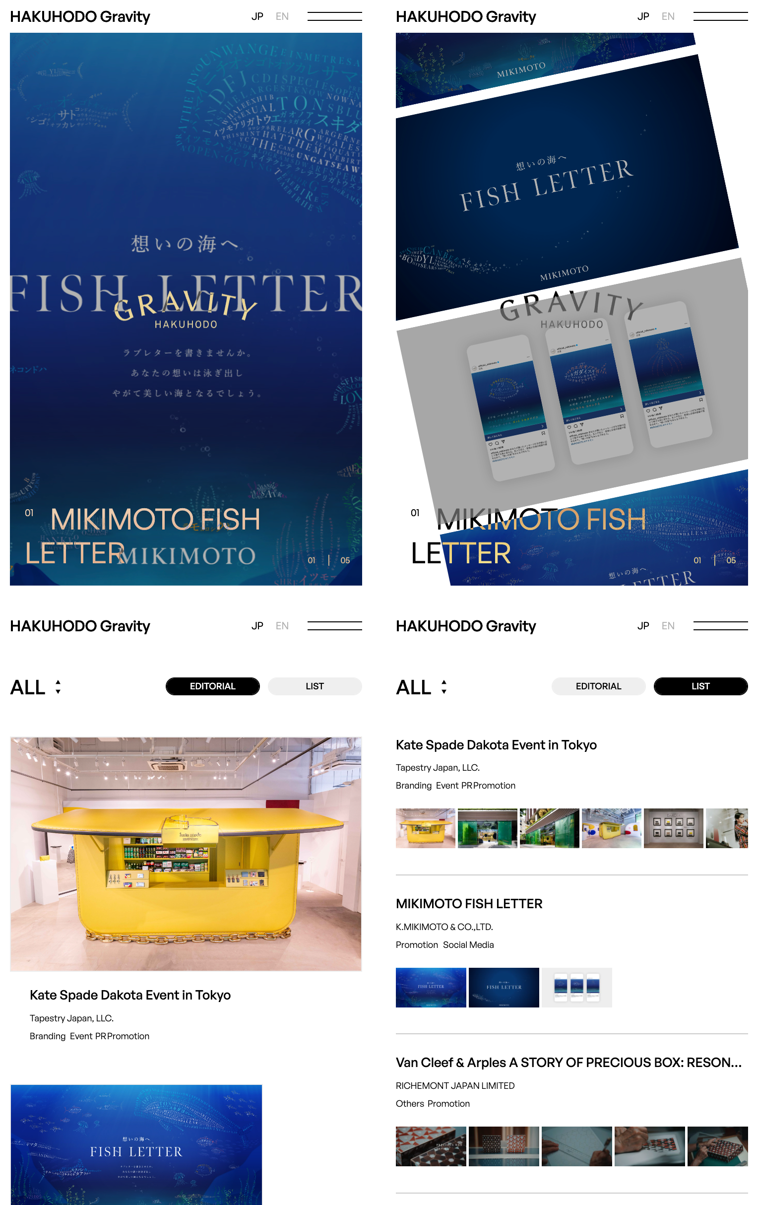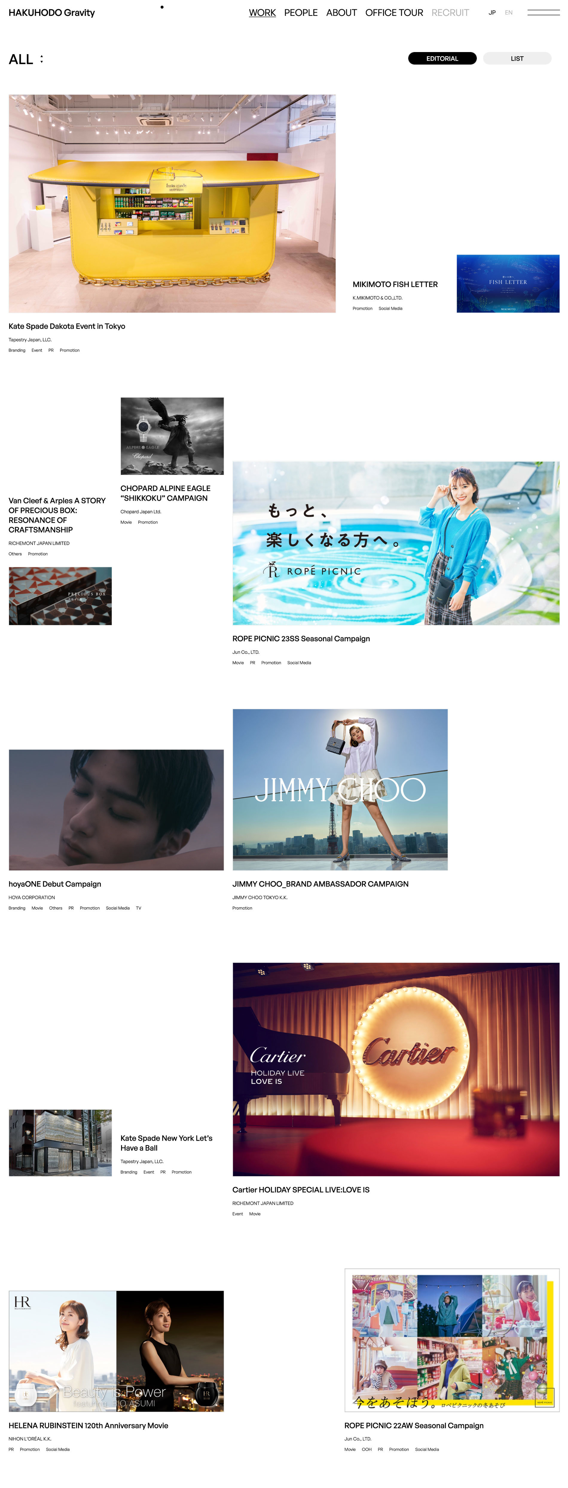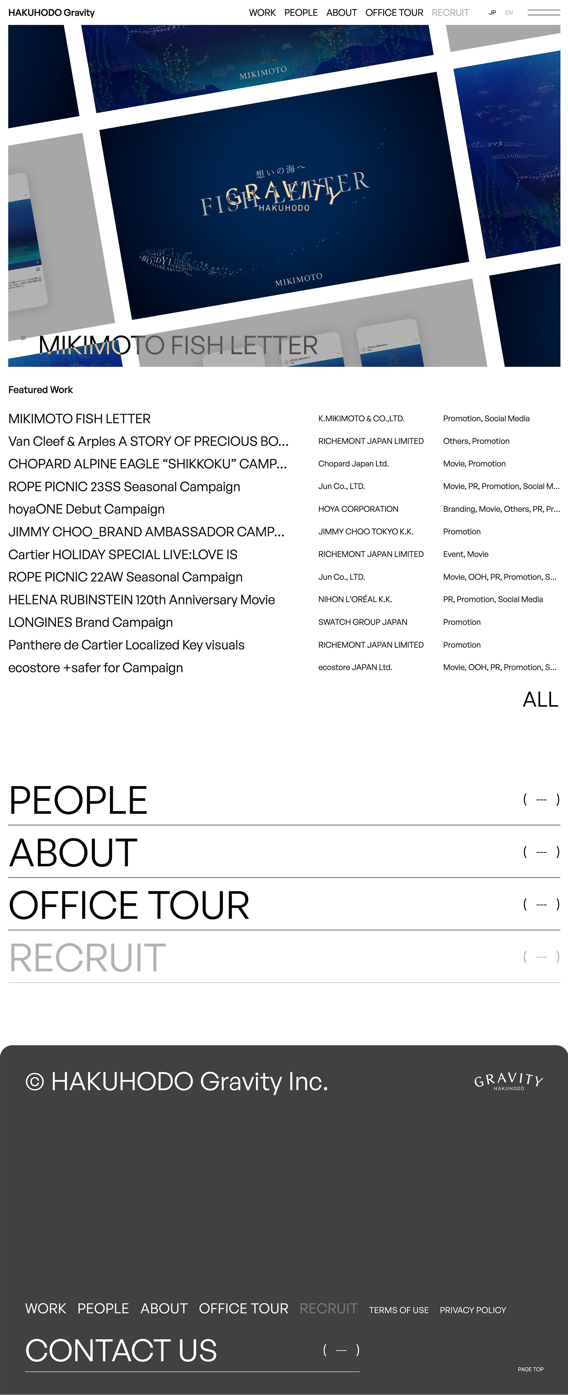 博報堂Gravityのコーポレートサイトを制作しました。WorkがReelライクになるシステムや全体的に重力を感じられるUIで構築。 博報堂Gravityのコーポレートサイトを制作しました。WorkがReelライクになるシステムや全体的に重力を感じられるUIで構築。