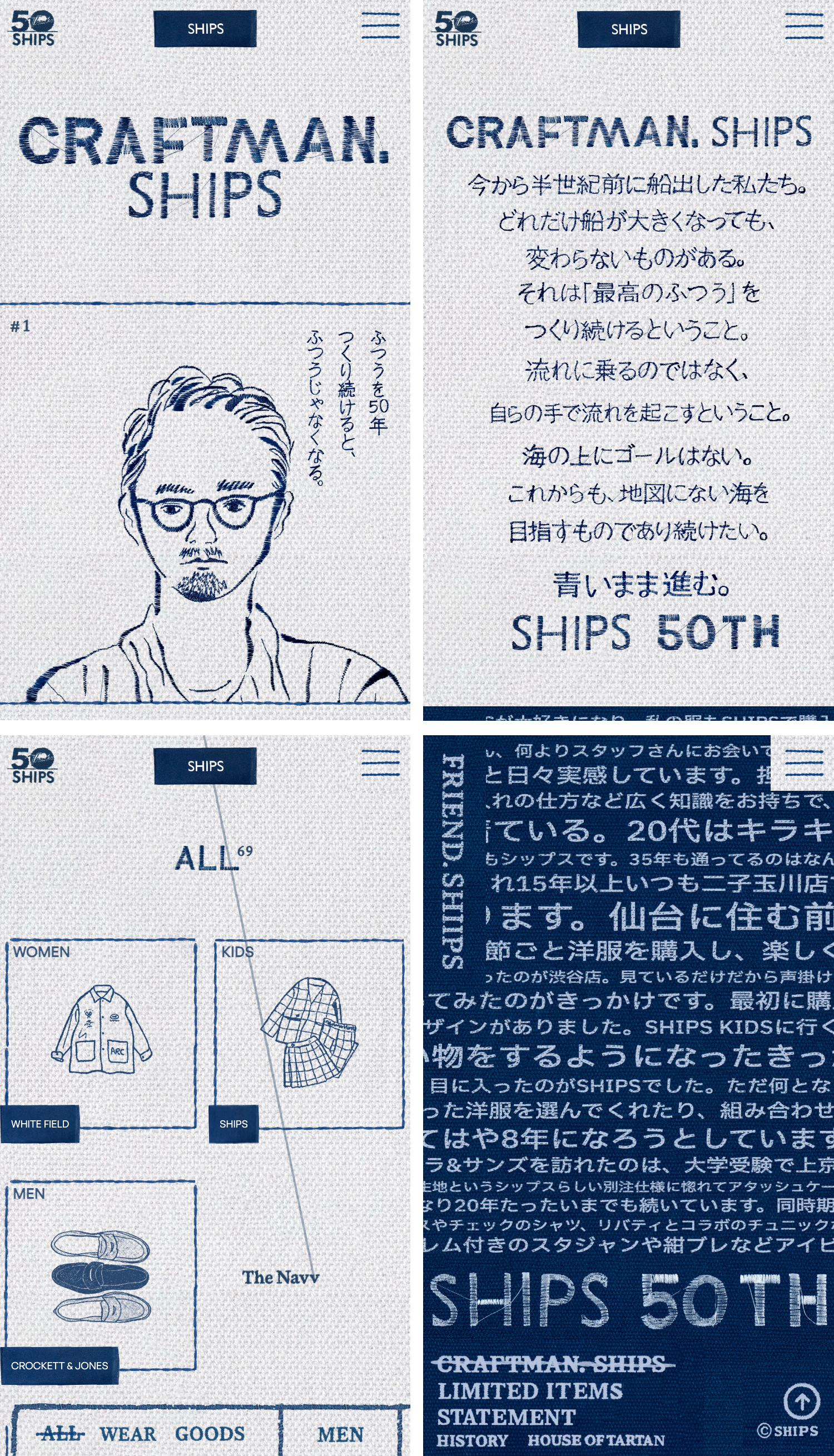 SHIPS 50TH 特設サイト「CRAFTMAN, SHIPS」制作しました。限定アイテムとともに、50年の軌跡を「刺繍が紡ぐ言葉」で演出しました。 SHIPS 50TH 特設サイト「CRAFTMAN, SHIPS」制作しました。限定アイテムとともに、50年の軌跡を「刺繍が紡ぐ言葉」で演出しました。